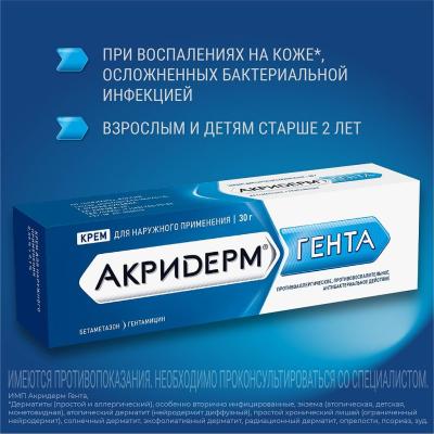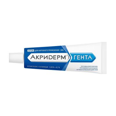 Акридерм ГЕНТА — це комбінований препарат, що містить глюкокортикостероїд та антибіотик широкого спектра дії. Бетаметазон дипропіонат — потужний глюкокортикостероїд, який зменшує запалення, набряк, свербіж та алергічні реакції. Він пригнічує активність лейкоцитів, зменшує виділення прозапальних медіаторів, знижує проникність судин та запобігає утворенню набряків. Гентамицин — це аміноглікозидний антибиотик, що має бактерицидну дію проти широкого спектра бактеріальних збудників. Він ефективний щодо грамнегативних бактерій, таких як Pseudomonas aeruginosa, Escherichia coli, Proteus vulgaris, Klebsiella pneumoniae, а також грампозитивних — Streptococcus spp., Staphylococcus spp. (коагулаза-позитивні та негативні штами). Гентамицин неактивний проти грибів і вірусів.