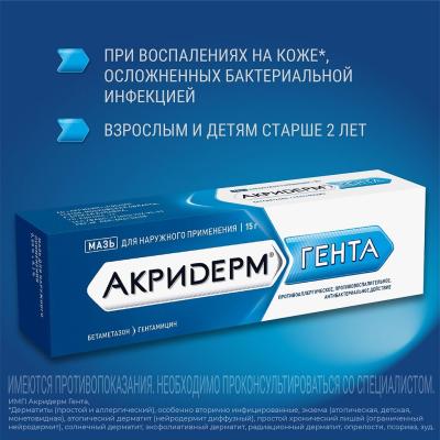 Акридерм ГЕНТА — комбінований препарат для зовнішнього застосування, що має протизапальні, противоалергічні та антибактеріальні властивості. Його застосовують для лікування різних дерматологічних захворювань, що супроводжуються запаленням і бактеріальною інфекцією. Основні активні компоненти — бетаметазон дипропіонат та гентаміцин сульфат, що забезпечують комплексний терапевтичний ефект.