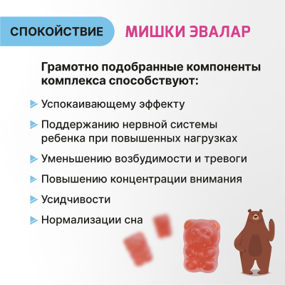 Это натуральный препарат для детишек в забавной форме в виде жевательных медвежат. Сыну почти 4 года, начались перепады настроения, капризы, плохо стал засыпать, а утром невозможно было поднять его с кровати. Состав отличный и растительный – это глицин для умственной деятельности, мята и мелисса для ... спокойствия, магний для нервной системы и витамин B6 для усиленного воздействия магния. Спустя недели 3-4 после приема сын стал спокойнее, перепады настроения стали реже, засыпает быстрее. Так что рекомендую! Ещё