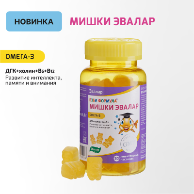 Продукт сприяє нормалізації функцій центральної нервової системи у дітей з підвищеною збудливістю та труднощами концентрації уваги. Спеціально розроблені жувальні пастилки допомагають зменшити прояви гіперактивності, підвищують рівень уваги та покращують якість сну.