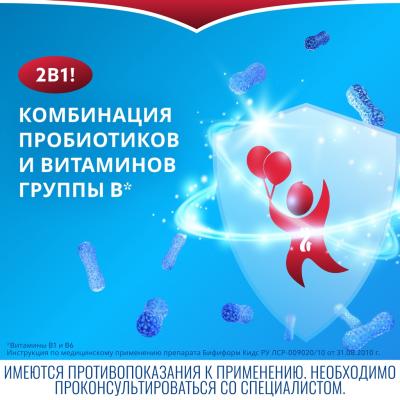 Біфиформ Кідс — це перший дитячий пробіотик серед лікарських засобів, що містить добре вивчені штами корисних бактерій у поєднанні з вітамінами В1 і В6, що сприяє відновленню та підтримці здоров’я кишечника у малюків. Препарат має приємний смак апельсиново-малинових фруктів і зручну форму для застосування у дітей.