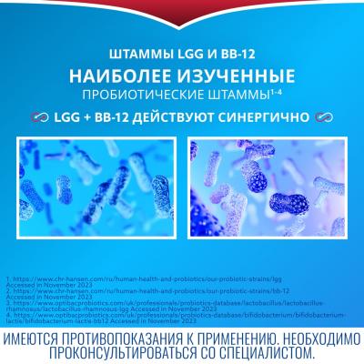 Комбінований препарат містить корисні бактерії — Lactobacillus rhamnosus GG та Bifidobacterium animalis BB-12, а також вітаміни B1 і B6. Вони працюють у синергізмі, підтримуючи та регулюючи баланс мікрофлори кишечника, підвищуючи стійкість слизової оболонки до патогенних мікроорганізмів. Бактерії пригнічують транслокацію патогенних мікроорганізмів у товстий кишечник та мають антагоністичний вплив щодо багатьох умовно-патогенних та патогенних мікроорганізмів, нормалізують імунітет при його пригніченні.