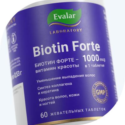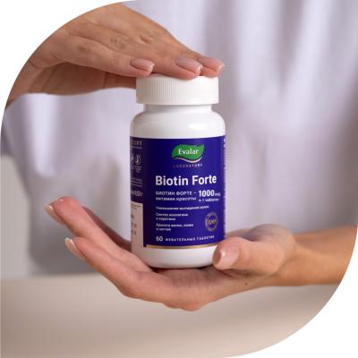 Biotin Forte від Evalar Laboratory — це зручні жувальні таблетки з приємним смаком, які не потребують запивання водою. Форма таблетки забезпечує швидке засвоєння біотину, що особливо актуально при його дефіциті. В одній таблетці міститься високий вміст біотину — 2000% від добової норми, що дозволяє ефективно заповнити його недолік. Препарат представлений у вигляді монопродукту, що дозволяє поєднувати його з іншими вітамінно-мінеральними комплексами. Біотин входить до складу ферментів, що регулюють обмін білків, жирів і вуглеводів, а також є джерелом сірки, необхідної для синтезу колагену. Вітамін Н (біотин) активно впливає на обмін жирів, контролює стан шкіри і волосся, регулює їхній жирний баланс. При його дефіциті можуть виникати себорейний дерматит, висипання та почервоніння. Застосування біотинових добавок сприяє покращенню структури та зовнішнього вигляду волосся, стимулює їхній ріст і підвищує густоту і блиск. Крім того, біотин бере участь у метаболізмі вуглеводів, жирів і білків, сприяє виробленню енергії та регуляції нервової системи, зокрема синтезу нейромедіаторів, включаючи серотонін — "гормон щастя".