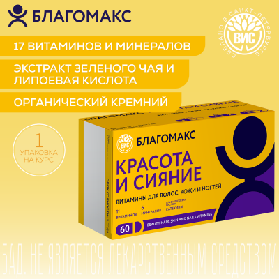 Біологічно активна добавка "БЛАГОМАКС КРАСОТА І СИЯННЯ" – це комплекс із 17 вітамінів і мінералів, з екстрактом зеленого чаю та альфа-ліпоєвою кислотою, який сприяє покращенню стану шкіри, волосся та нігтів, знижує ризик їх пошкоджень і передчасного старіння. Активні компоненти сприяють підтримці тонусу і еластичності шкіри, запобігають сухості та лущенню, зменшують запальні процеси, сприяють здоровому кольору обличчя, зміцненню нігтів та росту волосся, попереджаючи їх випадання. Комплекс сприяє антиоксидантному захисту та зміцненню імунітету.