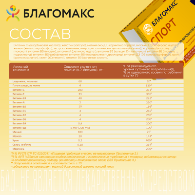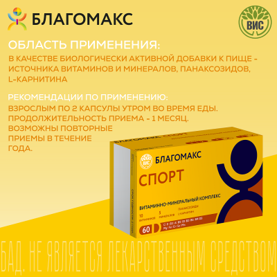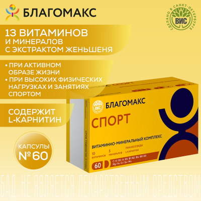 Вітамінно-мінеральний комплекс «Благомакс Спорт» спеціально розроблений для осіб, які займаються спортом, фітнесом або ведуть активний спосіб життя. Його склад включає унікальний набір необхідних при фізичних навантаженнях вітамінів і мінералів у біодоступній формі. Комплекс додатково посилений екстрактом кореня женьшеня та L-карнітином, що сприяє підвищенню витривалості, швидкому відновленню після тренувань та покращенню енергетичного обміну в м'язах.