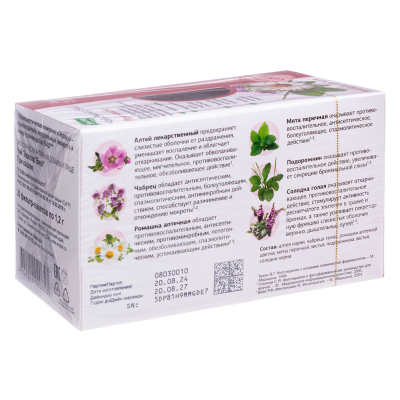 | Корінь алтея | Профілактика та зняття запалення слизових оболонок, обволакуюча дія, сприяє зменшенню кашлю та покращенню стану дихальних шляхів. |