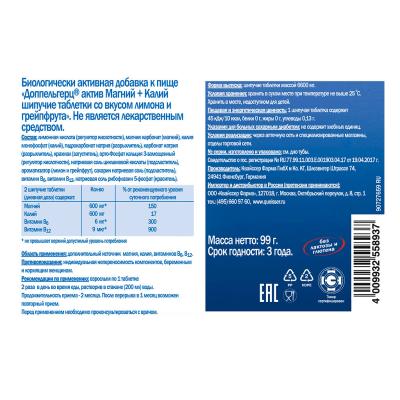 Доппельгерц Актив Магний+Калий со вкусом лимона и грейпфрута шипучие таблетки массой 6600 мг 15 шт