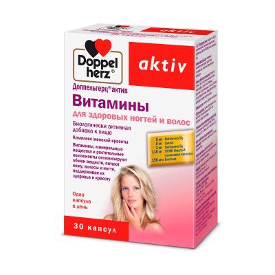 Доппельгерц актив Вітаміни для здорових волосся і нігтів — біологічно активна добавка до їжі, що є комплексом жіночої краси. Входять у склад вітаміни, мінеральні речовини та рослинні компоненти оптимізують обмін речовин, сприяють живленню шкіри, стимулюють ріст і зміцнення волосся та нігтів, відновлюють їх структуру та допомагають протистояти агресивним факторам зовнішнього середовища.
