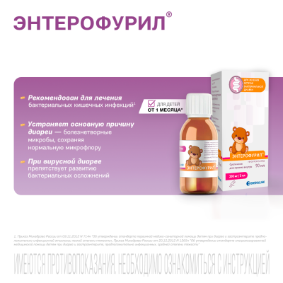 ЕНТЕРОФУРИЛ® — це препарат першої лінії для терапії бактеріальної діареї. Він усуває причину захворювання — шкідливі мікроби та бактерії, діючи локально у просвіті кишечника. Препарат сприяє збереженню нормальної мікрофлори кишечника і запобігає розвитку бактеріальних ускладнень при вірусній діареї.