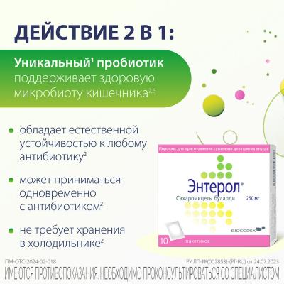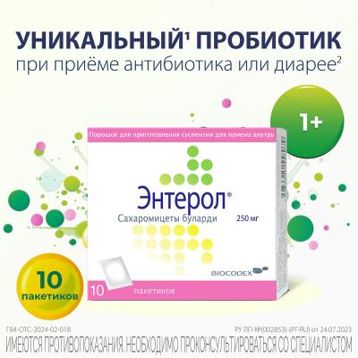 Энтерол® — це порошок для приготування суспензії для внутрішнього застосування у вигляді унікального пробіотика, який підтримує здорову мікробіоту кишечника. Це універсальний засіб, що має протидіарейний ефект, сприяє зниженню кількості патогенних мікроорганізмів і їх токсинів, а також відновлює природну флору кишечника.