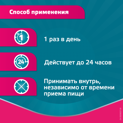 Препарат не має седативної дії, практично не впливає на центральну нервову систему і не викликає сонливості при застосуванні в рекомендованих дозах. Діє починаючи з 30 хвилин після прийому і зберігається до 24 годин.