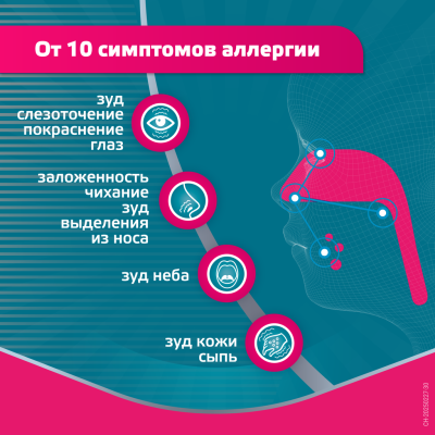 - Алергічний риніт: для зменшення або усунення симптомів, таких як чхання, закладеність носа, виділення з носа, свербіж і покрасніння очей, сльозотеча.